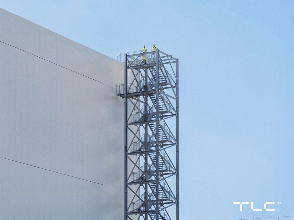 For this investment, TLC designed and manufactured a steel staircase with a total height of 38.7 m and a weight of 39.1 tones. The entire scope – from detailed design, through in-house production in machine park, to on-site installation – was carried out directly by TLC. Thanks to this comprehensive approach, the investor avoided the risks of splitting the work between several contractors, saving time, costs, and eliminating potential delays.